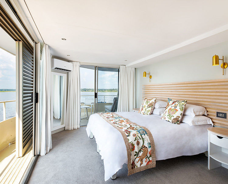 During your Africa Safaris & Wildlife Cruise’s 4-night river cruise, glide along the Chobe River on the regal Zambezi Queen. Refurbished in early 2023, the ship now features designs inspired by celebrated South African artist Denby Meyer woven into the soft fabrics of its furniture. Enjoy the allure of these gorgeous patterns in the lavish public spaces as well as within the 14 private suites you and your fellow cruisers will call your home away from home.