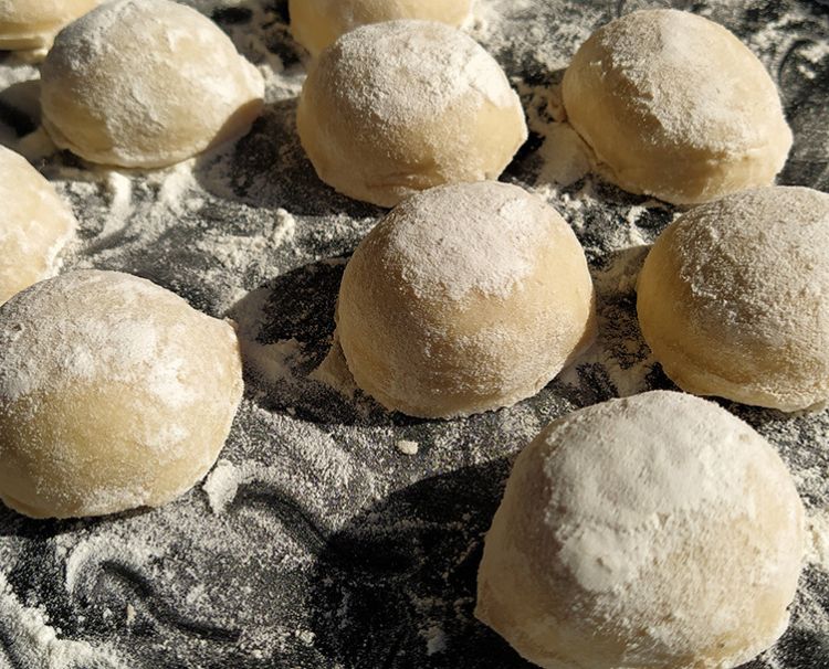 To shape the dumplings, keep your hands well-floured. Using a soup spoon scoop out a generous portion of dough, flatten it with your hands, place an apricot, slit side down, on the dough and wrap the dough around the apricot, sealing the edges. Lightly shape the dumpling into a ball. Place dumplings on a plate and keep chilled.