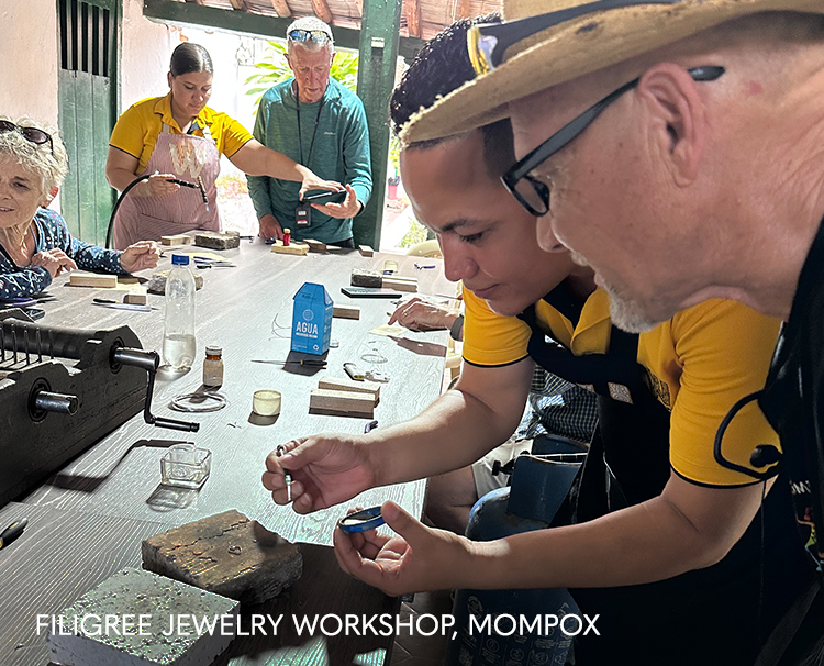 In addition to artistic performances, local villagers demonstrate some of their trades, such as cigar rolling, fish net weaving and filigree jewelry making in Mompox. Excursion boats take guests through the floating village of Nueva Venecia as well as on birdwatching and nature tours. Another form of transportation featured on our itineraries is a paola in Calamar (a bicycle taxi for two). For Trish, these experiences highlighted some of what makes Colombia unique. “Every day on the cruise just got better and better,” she offered.