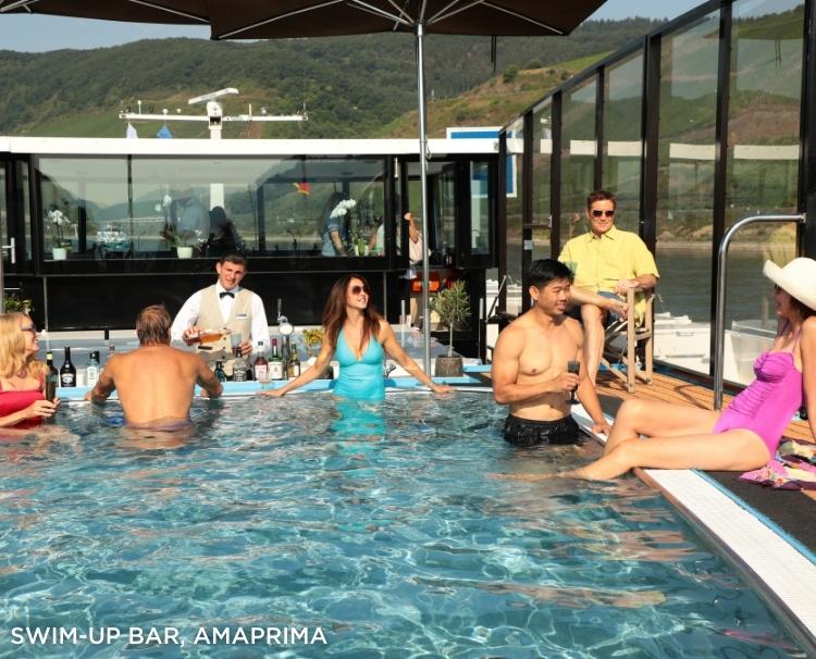 9. Expansive, Amenity-Filled Sun Decks – All of our ships feature a heated sun-deck pool or whirlpool (or both on board AmaMagna), and many of our newer ships include a swim-up bar. In addition, there is a walking track and space for wellness activities led by a Wellness Host, with additional amenities such as a golf putting green or giant chess board on select ships.