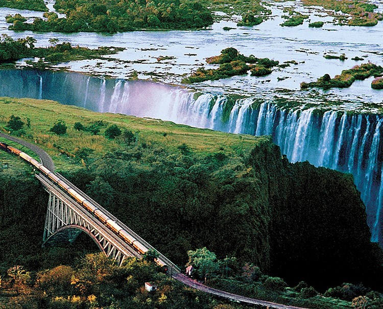 Enjoy a morning cruise during breakfast and be on the lookout for wildlife. Afterward, transfer to the legendary Victoria Falls, one of the world’s greatest natural wonders. Spend the afternoon exploring the town or experience one of the many activities offered at your hotel. Later this afternoon, join a cocktail reception followed by dinner aboard a vintage steam train and make your way to the Victoria Falls Bridge to watch the sunset over the Falls. (B, D)