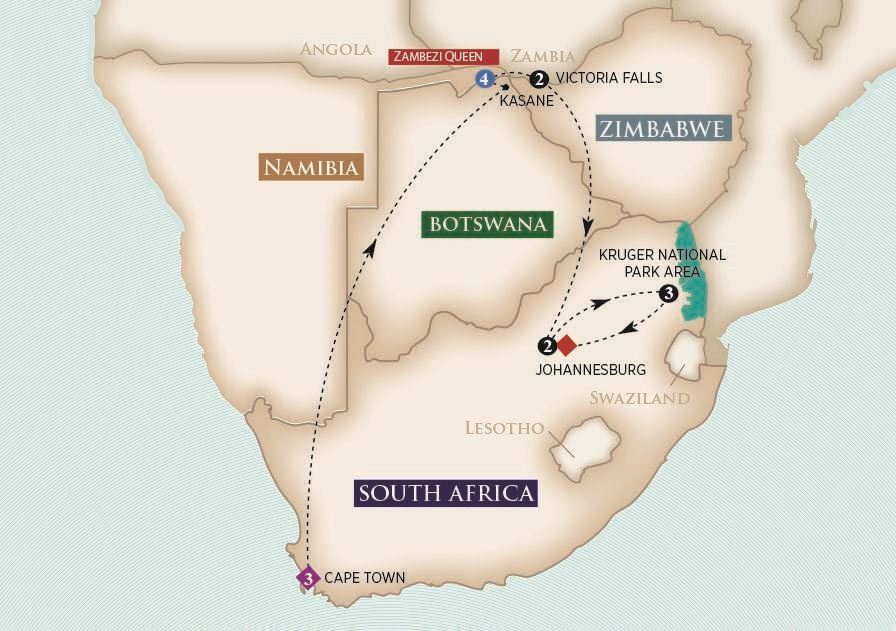 3 NIGHTS CAPE TOWN, 4-NIGHT SAFARI CRUISE, 2 NIGHTS VICTORIA FALLS, 2 NIGHTS JOHANNESBURG, 3 NIGHTS GREATER KRUGER NATIONAL PARK