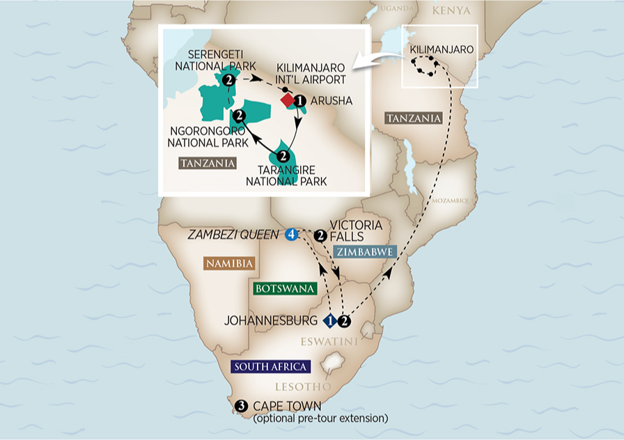 Your journey begins with an overnight stay in Johannesburg (option to start with 3 nights in Cape Town). Next, fly to Kasane, Botswana and board the Zambezi Queen, your wildlife river cruise vessel on the Chobe River for the next 4 nights. Enjoy two nights at Victoria Falls, one of the Seven Natural Wonders of the World. From here, fly to Johannesburg for two nights at your intimate, all-suite hotel. Depart to Nairobi where a connecting flight brings you to your Tanzania safari. Enjoy two nights at three of the four luxury Tanzanian lodges: Tarangire Treetops, The Manor at Ngorongoro, and the luxury-tented Serengeti Migration Camp or Serengeti Pioneer Camp.