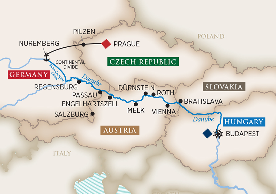 Discover a wealth of history, cultural treasures, and seasonal festivities ahead of the holiday crowds as you cruise to some of Europe’s most famous destinations aboard one of the most elegantly decorated ships on the Danube. From the world-renowned Christmas Markets scattered throughout Europe’s grandest cities, to the 2,000-year-old town of Regensburg, your journey along the Danube will bring you to the brightest holiday gems along the Danube. Along the way, visit magnificent cathedrals and Baroque abbeys, sample Vienna’s sinfully rich Sacher-Torte cake, experience the breathtaking scenery of the Wachau Valley winemaking region and traverse Europe’s Continental Divide.