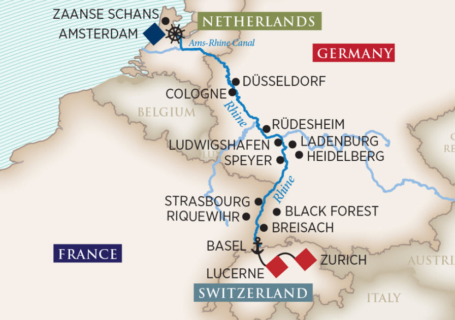 Contoured by vineyard-clad hills and castles from yesteryear, the legendary Rhine River captivates – and we invite you discover the flavor of this tantalizing region on a Celebration of Wine River Cruise with enhanced epicurean experiences included in the price of your cruise. Immerse yourself in the allure of France’s Alsace region in its welcoming capital, Strasbourg, and its priceless gem, Riquewihr. Discover Breisach, rising above the vineyards of the Rhine, and Freiburg, one of Germany’s sunniest cities. Fabled towns lost in time present you with the chance to taste local flavors—Rüdesheimer coffee, Riesling wines, and legendary German beer—and to touch history up close with guided hikes and bike rides. From Amsterdam’s colorful canals to the majestic Swiss Alps, journey into the heart of the destinations you visit.