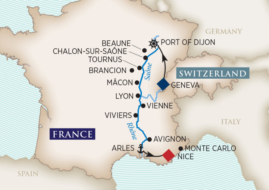 Indulge in the local flavors of Switzerland and France on a palate-pleasing itinerary that highlights the essence of France’s Burgundy and Provence. Discover Geneva and Annecy, the “Pearl of the French Alps” before embarking your 7-night Chalon-Sur-Saône to Arles cruise. Uncover the Roman history of Chalon-sur Saone and delight in charming Tournus with its towering Romanesque abbey and historic apothecary shop. Visit French châteaux from Burgundy to Provence, taste your way through the French culinary capital of Lyon and visit the Papal Palace in Avignon. Then, get ready to spend three nights in Nice taking in the top sites, as well as breathtaking Monaco and opulent Monte Carlo. While you’ll get more than a taste of Switzerland, Burgundy, Provence and Nice during this itinerary, the essence of these destinations will linger on your palate – and in your heart – for a lifetime!