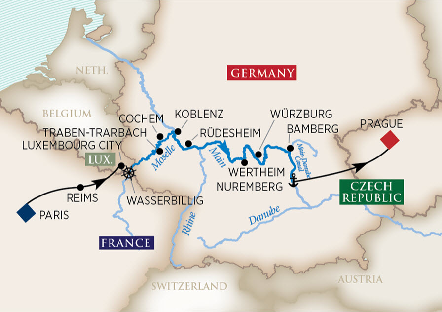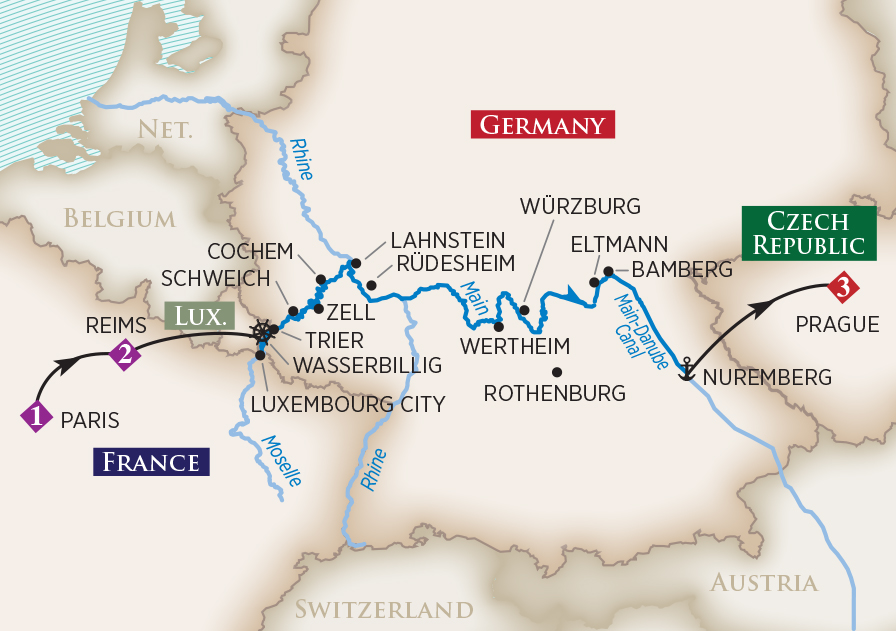 Two iconic cities, Prague and Paris, bookend this perfect journey that combines three beautiful rivers, each of which is striking in its own unique way. From the meandering Main to the UNESCO-designated Upper Middle Rhine Valley with its multitude of castles dotting its shores to the vineyard-clad hills of the Moselle, enjoy Europe at its most picturesque. Let the storybook villages—Bernkastel, Cochem and Wertheim—captivate you; and Rothenburg, located on the Romantic Road enchant you. Marvel at the world's largest ceiling fresco in the Würzburg Residenz, a UNESCO World Heritage Site; and the beautiful Chagall windows while in Mainz. Savor the many flavors of Germany with a chance to sample the world-famous wines of the Rheingau, the hearty smoked beer of Bamberg and Rüdesheim’s famed coffee. All along the way, gain an intimate understanding of the history and culture of the places you visit.