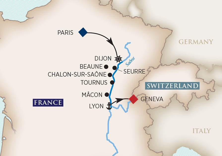 *Please be advised the ship will be docked in Saint-Jean-de-Losne and is located approximately 30 minutes’ walk from the train station. Purchasing one of our transfer options between Saint-Jean-de-Losne and Dijon is strongly recommended for guests embarking on our 7-night cruise without a post-cruise land package.