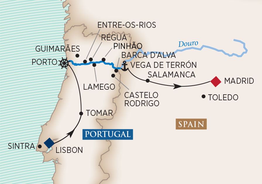 Two iconic cities, Lisbon and Madrid, provide the perfect start and end to a grand journey through Portugal and Spain. Cosmopolitan Lisbon offers a treasure trove of Old World architecture and a wealth of stories about its famed explorers; and then there is the seaside town of Sintra, one of the loveliest mountain villages in Portugal and a favorite summer residence of the Portuguese royal family for more than 500 years. Set sail in Porto, the beautiful “City of Bridges” and gateway to the Douro River Valley, a UNESCO World Heritage Site, with rambling vineyards and charming quintas, which cling to the steep sides of the river. Taste wines from these vineyards and discover the timeless traditions of Portuguese winemaking throughout your journey before visiting some of Spain’s glorious cities: the golden-hued city of Salamanca, the ancient walled city of Toledo, and cosmopolitan Madrid, renowned for its world-class museums, stately gardens and lively tapas bars.
