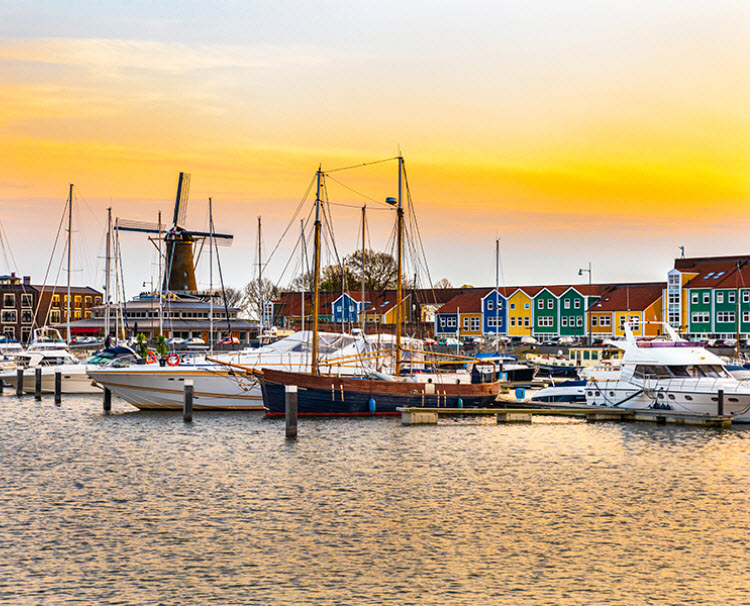 Enjoy a scenic morning cruise through the delta before arriving in Hellevoetsluis, an island metropolis of South Holland. During your tour of this medieval harbor town, you may see enchanting sites such as its iconic working De Hoop windmill and witness the charming wharf houses. Later in the day, you may discover the intriguing history of how the Delta Works, a unique storm surge barrier, came to be while visiting the Flood Museum. More than half of the Netherlands lies below sea level and the Delta Works were built to prevent a recurrence of the 1953 flood disaster. For those who prefer an active adventure, pedal from Hellevoetsluis, with its cobblestone streets and charming harbor, across the Haringvlietdam and back. (B,L,D)