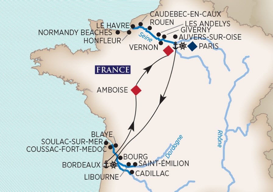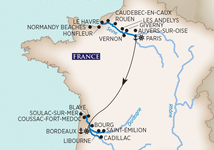 Immerse yourself in the rich history, captivating art, vibrant culture, and epicurean delights of France on this enchanting 14-night journey along four spectacular waterways: the Seine, Garonne, and Dordogne rivers and the Gironde Estuary. Depart from the “City of Lights” and head through Normandy for the opportunity to pay your respects on the D-Day landing beaches. Whet your palate for the Bordeaux delights to come by sampling the Normandy's famed Calvados, cider, and cheese. Step inside Monet’s paintings at his home and gardens in Giverny, visit idyllic châteaux, and pedal through the French countryside before cruising back into Paris with the Eiffel Tower as your backdrop. Then, board your train for Bordeaux, where you will sip a variety of wines from this famed wine region and marvel at historic architecture, from the UNESCO-designated Blaye Citadel to the impressive Roquetaillade Castle and even Bordeaux’s marvelously modern Cité du Vin wine museum. This is the ideal itinerary for those who want more than “just a taste” of France.