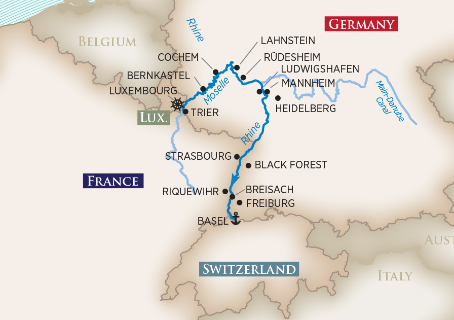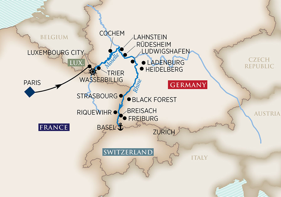 Paris provides the perfect beginning and ending to your splendid journey along two of Europe’s most alluring rivers, the Rhine and Moselle. In between, expand your imagination in fairytale villages—enchanting Cochem where folklore and history come alive in every street, and in well-preserved Bernkastel with its medieval Market Square and half-timbered houses. Whimsical fantasies abound at Siegfried’s Mechanical Musical Instrument Museum and at the Palace Gardens of Schwetzingen, a cultural heritage site of European significance with more than 100 sculptures scattered throughout its surprising landscape. Blend German heritage with Italian in Trier, with its Roman Imperial Baths and the Porta Nigra; and with French heritage in Strasbourg, and you have the most splendid journey