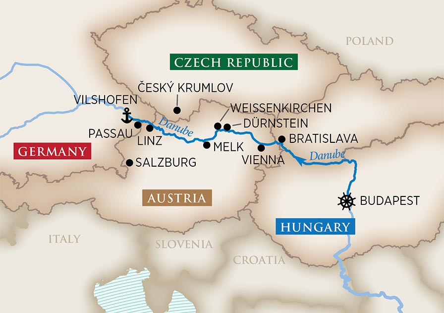 After reaching Weissenkirchen, you’ll have a choice of excursions. Join a walking tour in Dürnstein and then taste some of the village’s distinctive wines. Or visit a local boutique to taste Durnstein’s special apricot treats, such as jams and chocolates. Prefer more active adventures? Join a guided bike tour from Weissenkirchen to Melk. For those not biking to Melk, you’ll sail through the UNESCO-designated Wachau Valley to Melk, where you will have the opportunity to visit the magnificent Benedictine Abbey. (B,L,D)