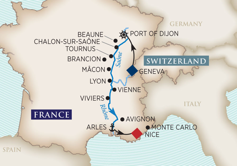 Indulge in French flavors on a palate-pleasing wine-themed itinerary that highlights the essence of France’s Burgundy and Provence. Discover Geneva and Annecy, the “Pearl of the French Alps” before embarking your 7-night Port of Dijon to Arles cruise. Uncover the Roman history of Chalon-sur Saône and delight in charming Tournus with its towering Romanesque abbey and historic apothecary shop. Visit French châteaux from Burgundy to Provence, taste your way through the French culinary capital of Lyon and visit the Papal Palace in Avignon. Treat your palate to Mâconnais, Beaujolais and Chalonnaise wines as you journey along the Rhône and Saône rivers. Then, get ready to spend three nights in Nice taking in the top sites, as well as breathtaking Monaco and opulent Monte Carlo. With a dedicated wine expert to guide you, you’ll also have the opportunity to indulge in wine tastings and a specially curated food and wine pairing dinner on board – all included in the price of your Celebration of Wine River Cruise. While you’ll get more than a taste of Switzerland, Burgundy, Provence and Nice during this itinerary, the essence of these destinations will linger on your palate – and in your heart – for a lifetime!