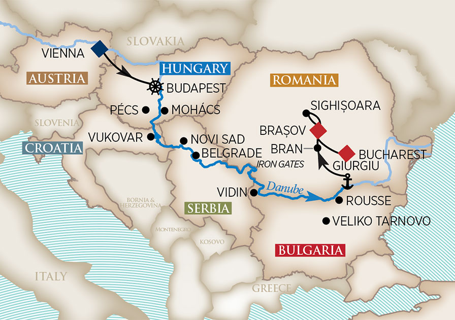 From Vienna to Bucharest, and countless treasures in between, the holiday season is a beautiful time of year along the lower Danube. Immerse yourself in the winter magic of Hungary, Croatia, Serbia, Bulgaria, and Romania. Celtic fortifications, medieval towns and grand cities await as they burst with traditional holiday cheer. You will relish the sight of beautiful landscapes, perhaps glistening with snow, and journey through the awe-inspiring Iron Gates. Wine and food lovers will have a chance to taste history from the centuries-old wine-growing hills dating back to the Romans and savor local seasonal sweets during Winterfest in Novi Sad, the first Christmas Market in Serbia. Be treated to the diverse culture and holiday joy on this unforgettable journey down the Danube.