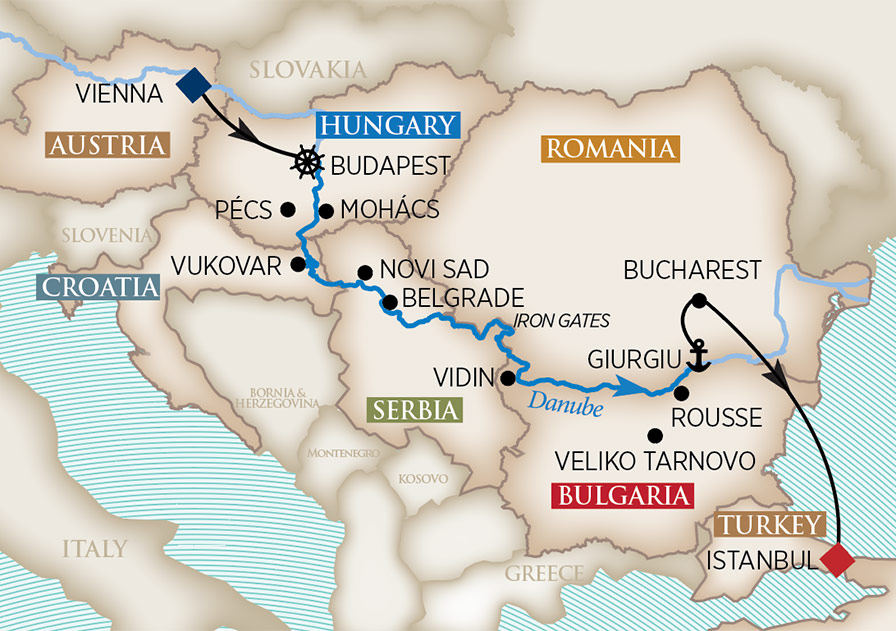 Disembark the ship in Giurgiu and board a motorcoach to journey through the Romanian countryside to Bucharest. Later, board your flight to Istanbul, where you’ll check into your hotel. (B)