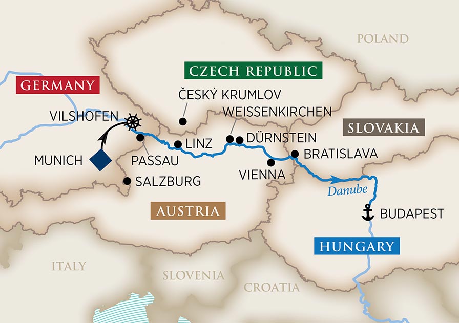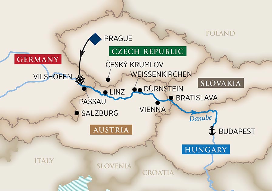 The ship arrives in Linz where you’ll have several choices of excursions. Opt for a full-day excursion to Salzburg where you’ll tour the historic center, Mirabell Gardens, Residenz Square and the Old Market. You may also choose to join a full-day excursion to the charming Czech mountain town of Český Krumlov, where you can stroll its cobblestone streets; marvel at the city’s picturesque Baroque and Renaissance-style buildings; and tour Krumlov Castle, one of Europe’s largest castle complexes. Following these full-day excursions, you may also choose to take a brief walking tour in Linz. Alternatively, join a walking tour through the old city center of Linz and by the Mozart House; or bike along the city’s famed “Cultural Mile” and the Danube. (B,L,D)