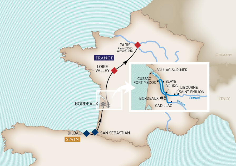 Begin your journey in the heart of Basque Country, Bilbao! Home to the world-renowned Guggenheim Museum, Bilbao is a cultural hub for rich history and flavorful cuisine. Then enjoy two nights in the stunning seaside resort of San Sebastián before embarking on your river cruise journey in Bordeaux. From romantic walks to red wine, Bordeaux is the cultural capital of all that is quintessentially French. Follow wine's journey from countryside to cask as you tour centuries-old vineyards and taste Bordeaux's finest vintages throughout your river cruise experience. Step into living history when you visit historic Roquetaillade Castle and Château Boutinet, delighting in their elegant décor and regal architecture. Then, contrast their grandeur with the pastoral gems including the historic village of Saint-Émilion and the seaside resort of Soulac-sur-Mer. After disembarking, you will venture into the UNESCO-designated Loire Valley, the all-important "Garden of France." Journey to Amboise, the final resting place of Leonardo da Vinci, before concluding your journey in the “City of Lights” which needs no introduction, Paris.