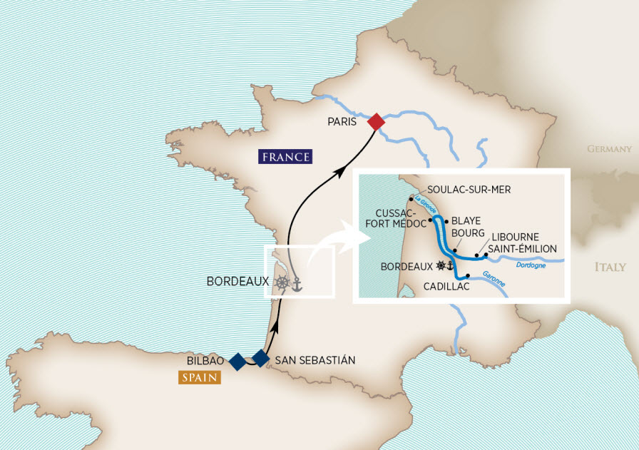 Check out of your hotel and transfer to Bordeaux via the French Basque town of Bayonne. Later, embark the ship in Bordeaux for your Taste of Bordeaux cruise. (B,D)