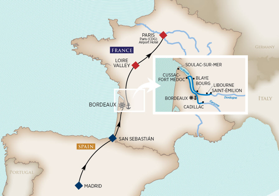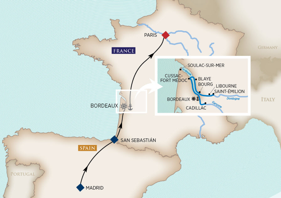 Begin your journey in the heart of Spain, with our new-for-2026 land package in Madrid! Explore the magnificent architecture within this culture-rich cosmopolitan metropolis. Then enjoy two nights in the stunning seaside resort of San Sebastián before embarking on your river cruise journey in Bordeaux. From romantic walks to red wine, Bordeaux is the cultural capital of all that is quintessentially French. Follow wine's journey from countryside to cask as you tour centuries-old vineyards and taste Bordeaux's finest vintages throughout your river cruise experience. Step into living history when you visit historic Roquetaillade Castle and Château Boutinet, delighting in their elegant décor and regal architecture. Then, contrast their grandeur with the pastoral gems including the historic village of Saint-Émilion and the seaside resort of Soulac-sur-Mer. After indulging in Bordeaux's colorful culture and rich flavors, you and your palate will remember this journey for years to come.