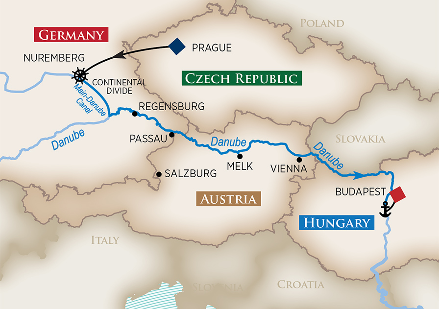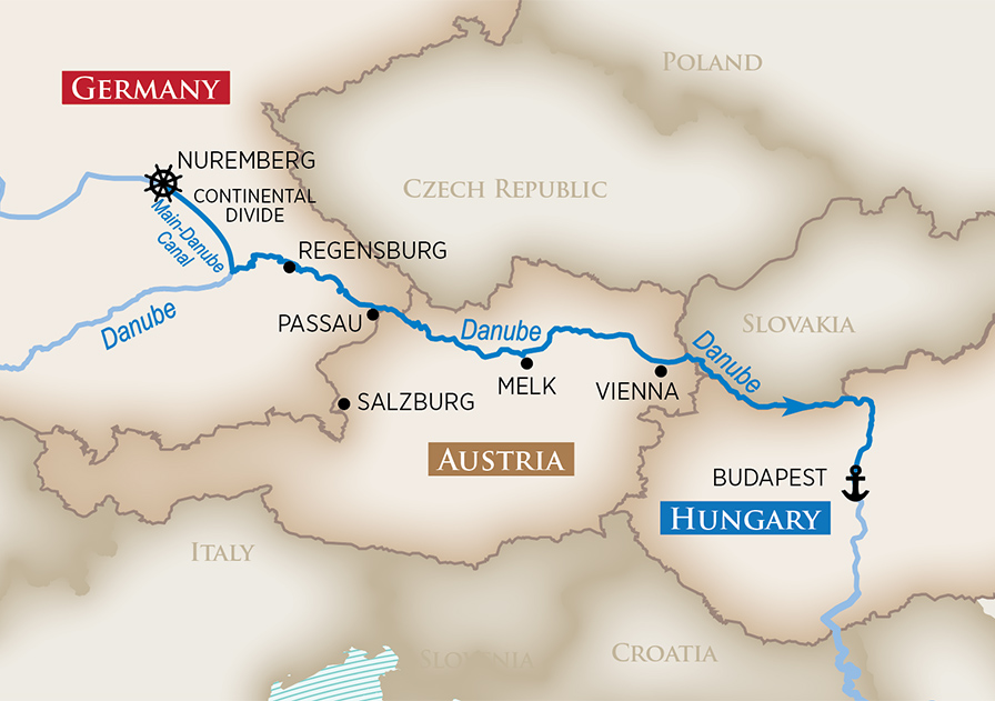 Join a city tour of WWII highlights and then walk through Nuremberg’s cobblestone streets to the Imperial Castle and 900-year-old city ramparts, followed by a visit to Nuremberg’s Christkindlesmarkt, one of the world’s largest and most famous Christmas Markets. You can also choose to spend the entire morning exploring this iconic Christmas Market. For those looking for a taste of Nuremberg, depart for Nuremberg Imperial Castle and visit City Brewery where you will delight your palate with savory Nuremberg sausage and beer. Then continue to Sebalder Kirche (church) where you will nibble on sweet and spicy lebkuchen, a baked treat similar to gingerbread. End the day crossing the Continental Divide via the Main-Danube Canal. (B,L,D)