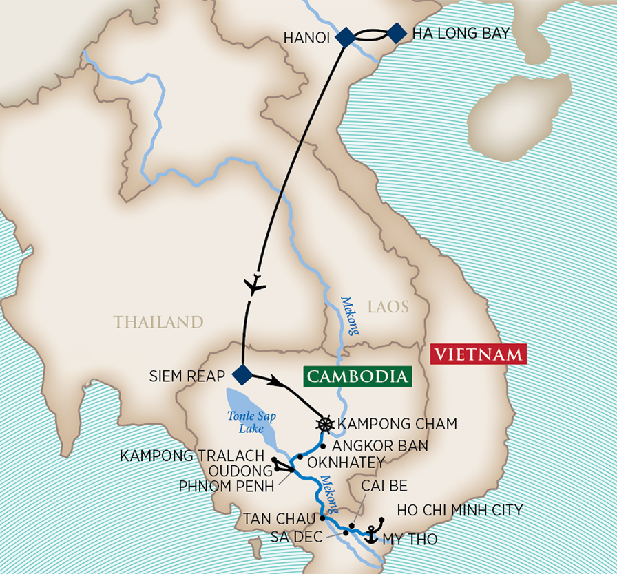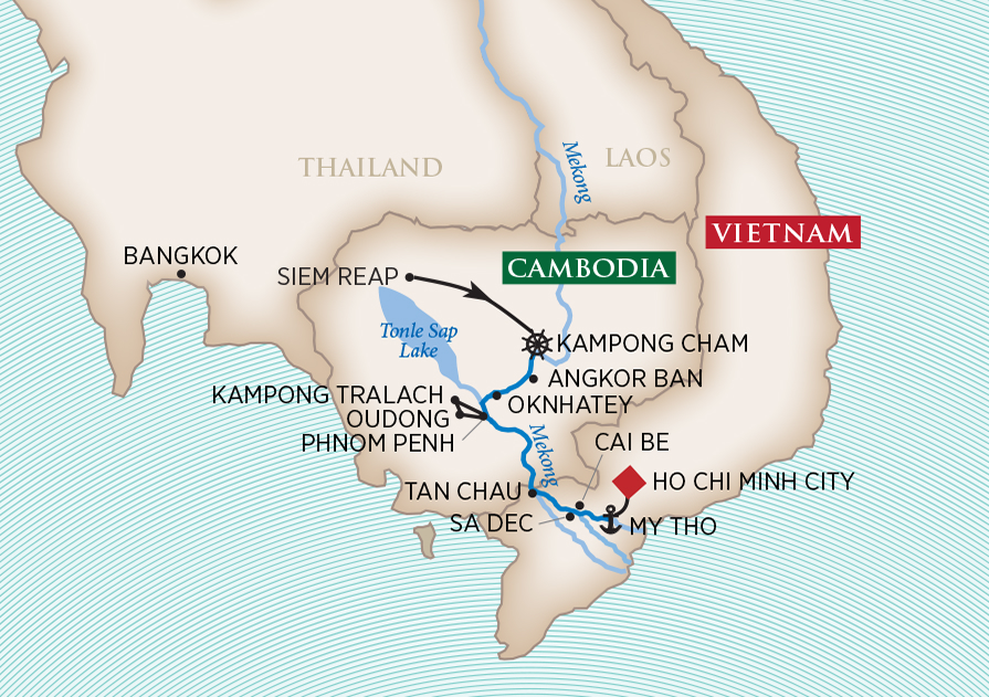 for an overnight stay aboard an elegantly appointed ship. A short flight to Siem Reap brings you to the gateway of the ancient Khmer empire where you’ll explore the temples of Angkor Archeological Park. Unleash your inner adventurer as you explore Angkor Wat’s amazing temples, including Banteay Srei, Angkor Thom, the Terrace of the Elephants, the pyramid temple of Bayon, Ta Prohm—the vine-covered “jungle temple”—Angkor Wat and other key sites. Cruise along the Mekong as you are transported back in time to another era, where the rhythms of the countryside move at a slower pace and allow for fascinating glimpses into a traditional way of life. After visiting rural villages, local workshops and markets, a monastery and two capital cities, conclude your cruise with a two-night stay in Ho Chi Minh City—once known as Saigon and the “Paris of the Orient”—now a bustling economic boom-town that offers a heady mixture of historic and modern delights.