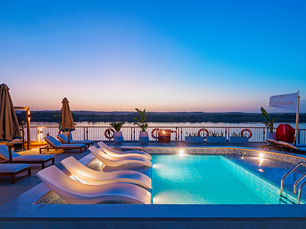 The comfortable Sun Decks on both ships offer 360-degree views of the ever-changing vistas on the Nile. The refreshing sun-deck swimming pools and shaded lounge areas are a perfect place to cool off after a full day of exploring under the careful guidance of our knowledgeable Egyptologists.