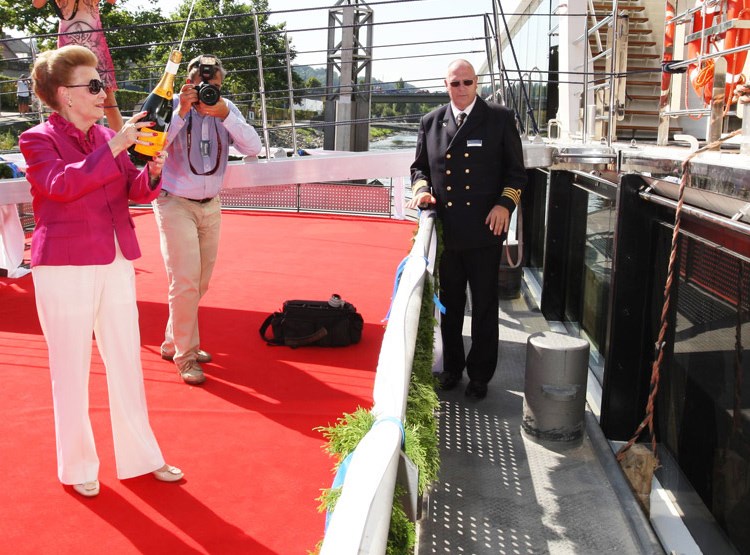 As I watched the champagne bottle burst against the hull of the newest addition to our fleet, I couldn’t help but feel grateful for all the support and loyalty our friends in the travel industry have shown us over the years, and all the guests who have made our dreams a reality. This christening event was a celebration of all that. And what a party it turned out to be! So much local color, with boisterous music, dancing, Bavarian entertainment, different bands, singers and even stilt-walkers dressed as giant butterflies! Vilshofen was truly the place to be on that beautiful sunny day.